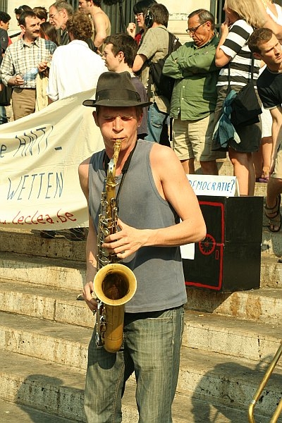 BRUSSEL -- Op 28 april organiseerden het Platform voor vrije meningsuiting en CLEA een solidariteitsmanifestatie op de trappen van de Beurs naar aanleiding van 1 jaar opsluiting van Bahar Kimyongür. Cassatie had net zijn veroordeling tot 5 jaar verbroken, wat natuurlijk voor een feestje zorgde in de Beursschouwburg, waar na de manifestatie verscheidene mensen spraken. Afgesloten werd er met een optreden van de Cubaan Rey Cabrera y sus amigos. Sfeer gegarandeerd!