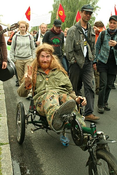 ROSTOCK -- Vandaag was het thema van de dag op de G8-protesten het verzet tegen militarisme, foltering en oorlog. Verscheidene rally's in Rostock verzamelden de betogers, waarna iedereen op de trein sprong richting Rostock-Warnemünde. Om het station te verlaten moest iedereen door een gesloten metalen loopbrug, waar aan het eind een overweldigende politiemacht stond. Iedereen die in het zwart gekleed liep, moest zijn tassen openmaken. De organisatoren konden na overleg met de politie bewerkstelligen dat er geen identiteitscontroles werden gedaan. Deze politie-actie vertraagde wel aanzienlijk de betoging. Zo'n 1.000 manifestanten wandelden vreedzaam door Warnemünde.