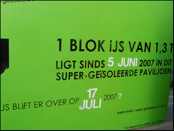 Op 5 juni 07,Wereldmilieudag,opende schepen voor milieu Guy Lauwers een tijdelijke PassiefHuisinstallatie aan het EcoHuis.In de installatie zit(zat)meer dan 1 ton ijs.Het doel is na te gaan hoe lang het ijs standhoudt tegen de warmte.