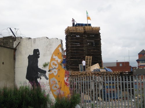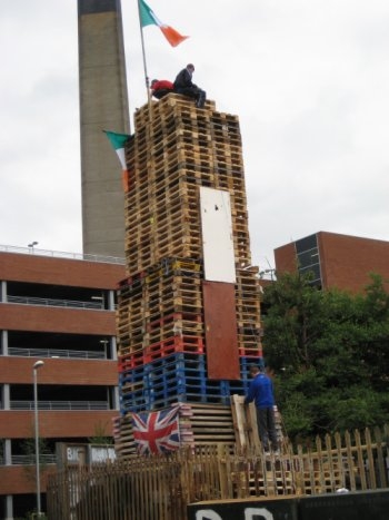 “Sandy row”, beruchte volkswijk in Zuid-Belfast. Ook hier worden voorbereidingen getroffen voor de “bonfires” later op de avond.