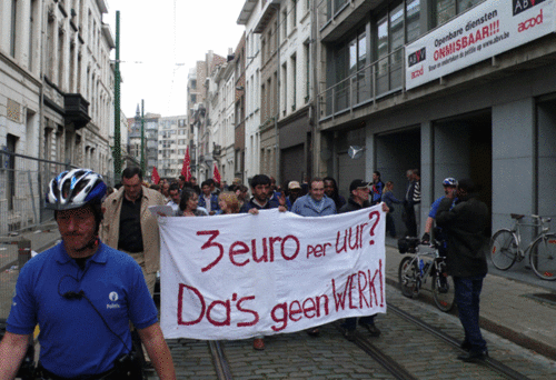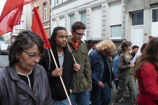 Hier trekken de betogers door de Ommeganckstraat voorbij het vakbondsgebouw, gelukkig was er ook ondersteuning van de BBTK(metaalbewerkers) zie rode vlaggen