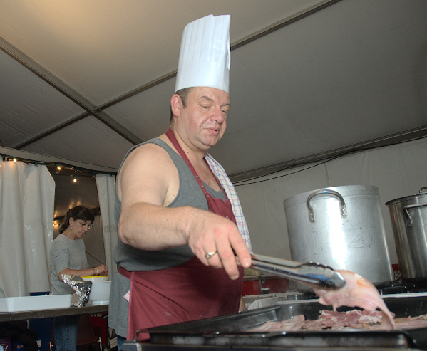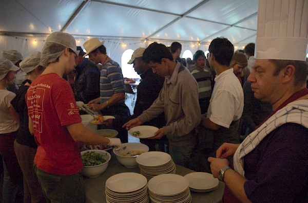 Ook Yolande is een vaste medewerker in de keuken. Zij werkt al jaar en dag mee, vroeger achter de bar en het onthaal, maar de laatste jaren werkt ze in de keuken mee aan de opbouw van het festival. “Het is heel tof om mee te kunnen maken hoe zo'n festival tot stand komt, om het te zien groeien en om samen te kunnen werken met al die mensen die dat realiseren.” “Maar een dag als vandaag is wel echt stressen hoor, een tent die wegwaait, de regen en de wind, je leeft echt mee met de opbouw en het is wel stressen om het allemaal in orde te krijgen.”