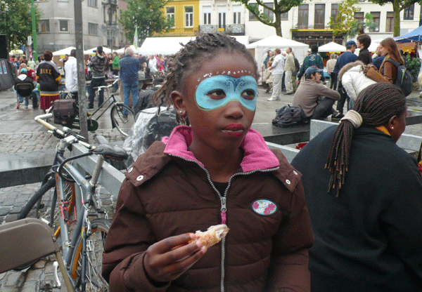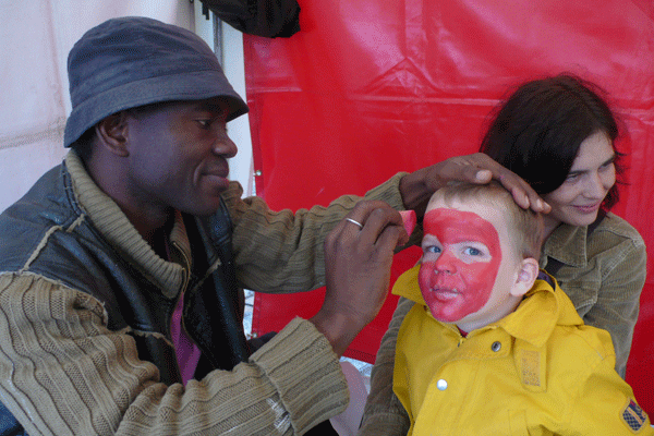 op elk festivalletje is er natuurlijk een schminkstand, meestal zijn het Belgische vrijwilligers die Afrikaanse kindjes schminken, hier dus omgekeerd