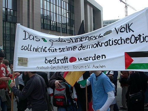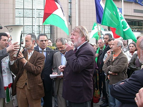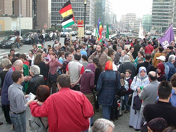 Brussel -- Enkele honderden mensen verzamelden zich vandaag aan het Schumanplein om te protesteren tegen de beslissing van de Europese Unie om alle financiële steun aan de Palestijnse autoriteiten stop te zetten. De betoging werd georganiseerd door de Association Belgo-Palestina en het Aktieplatform Palestina. Er kwamen ook delegaties van Palestijnse organisaties uit Frankrijk, Nederland en Duitsland om de actie mee te ondersteunen.