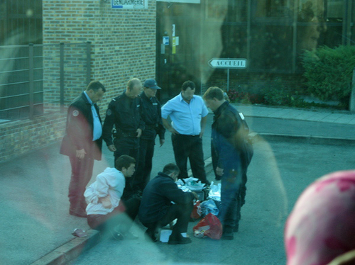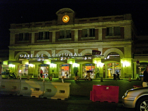 De bus is, vlakbij een hekken, zo geparkeerd dat ze met 2 douanen aan de voor- en 2 douanen aan de achter-zijde, de 50 reizigers gemakkelijk kunnen in 't oog houden. De 5de douane doet me denken aan 'Brit' van Flikken, zij leidt de actie. 'Brit' plukt een reiziger uit de hoop en even later zit hij geboeid op de grond. Hoe hij zich verraden heeft kan ik vanop mijn plaats niet zien. Op de bus loopt het gerucht dat het om 4 kg drugs gaat verdeeld in minstens 2 pakken, maar niemand weet welke drugs. Alle pasagiers wachten geduldig tot we 'losgelaten' worden. Heel de actie bezorgt ons 3.30u oponthoud. Voor iedereen lijkt het duidelijk dat ook de drugskoerier een grote verantwoordelijk draagt voor de miserie door druggebruik. (bijna) Alle plaspauzes vervallen en de bus rijdt snel. De rit is niet comfortabel, door de (te) hoge snelheid slingert de bus een beetje. De bus stopt met slechts een half uurtje vertraging in Perpignan. Ik ben moe het is tijd voor een koffie.