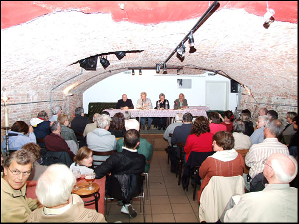 De zaal was te klein. Met spoed werden een tiental stoelen bijgevoegd. Toch stonden er nog evenveel mensen recht. Voor een twee uur 'lang ' boeiend gesprek.