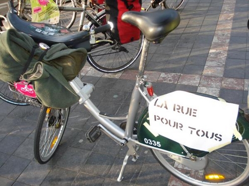 Fietsen werden getooid met slogans. Hier een fiets van het fietsleensysteem cyclocity met de slogan 'La rue pour tous'. De slogan waarmee Bral en Inter Environnement Bruxellen opriepen om actie te voeren tijdens de Brusselse Week van Vervoering.