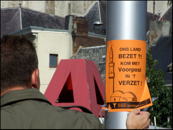 Tijdens de manifestatie,gericht tegen wat Voorpost de islamittisering van de Vlaamse steden en gemeenten noemt,waren er toespraken van Hugo Coveliers en Voorzitter Johan Vanslambrouck.Voorpost wilde protesteren naar aanleiding van de steun van de stad voor het islamitisch feest 'Sultan der Maanden'(gratis maaltijd),(zie andere fotoreportage),het verbod om te betogen in Brussel op 11 september en het,volgens Voorpost,brutale optreden van de politie tegen de manifestanten die wel opdaagden.