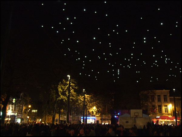 Wat nog ontbrak,was een prachtige sterrenhemel!Duizend kleine Led-lichtjes vormen vanaf zaterdag op twaalf meter hoogte een levensechte sterrenhemel boven de Dageraadplaats.Wie goed kijkt ziet bijvoorbeeld de Kleine Beer,de Grote Beer,de Pooslter en de sterrenbeelden.