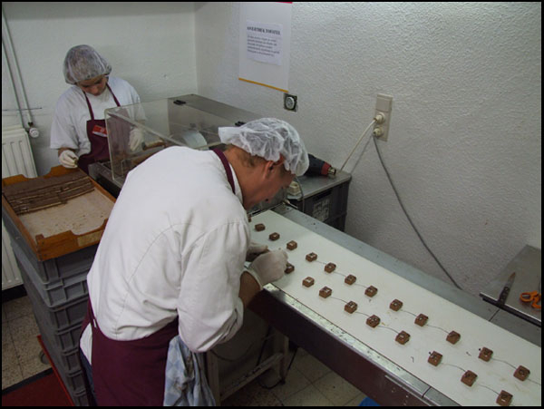 De staart van de file kreeg een luxueuze folderboekje(drietaalig in deze Joodse buurt) met allerlei informatie over de verschillende soorten van pralines.Bezoekers kwamen binnen langs de werkplaats in de zijstraat en gingen naar buiten langs de winkel zelf.Een aangenaamde jonge personeelslid verwelkomde iedereen met een schaal assortimenten pralines.Toon was direkt gegeven dat iedereen hier welkom was.