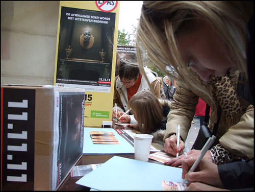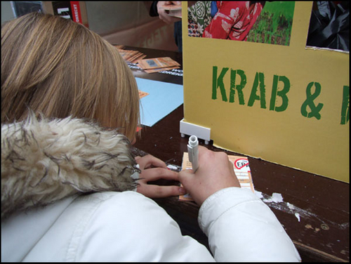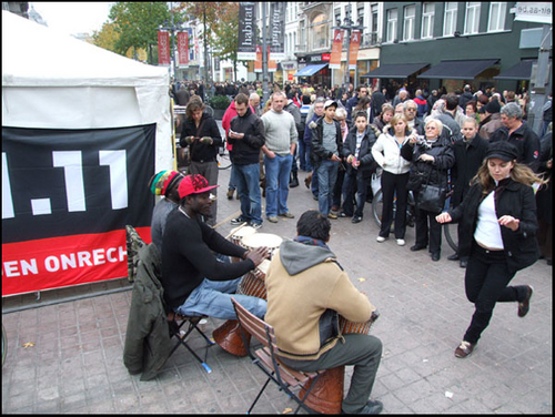 Tweedaagse actie van 11.11.11 in Antwerpen deze vrijdag en zaterdag. Zo werden er krabloten uitgedeeld als symbool voor het wegkrabben van de EPA-akkoorden. Handtekeningen werden op de Wapper verzameld met djembégroep die voor ambiance zorgde. En ambiance was er!