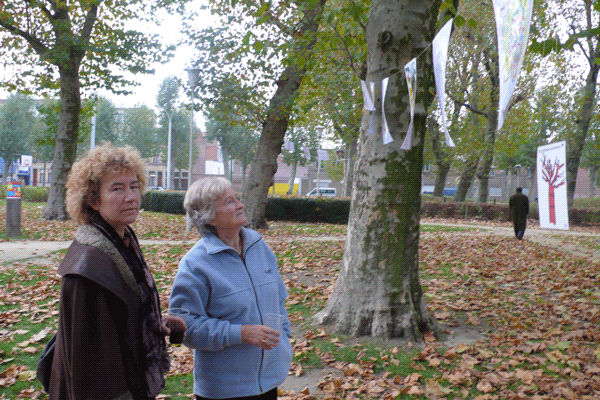 De bewoners van het plein en omliggende straten komen de teksten lezen en de foto's en tekeningen bekijken.