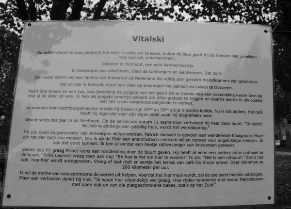 Ook Vitalski, de nachtburgemeester, werkte mee aan dit project. Hij woont 6 jaar in de Seefhoek en is hier komen wonen op de bewuste elfde september 2001. Afkomstig van de Turnhout (Kempenboerke zoals hij zelf zegt), zijn ouders waren vroeger marktkramers. Woont toch wel graag in de Seefhoek, lees bijgaande tekst!