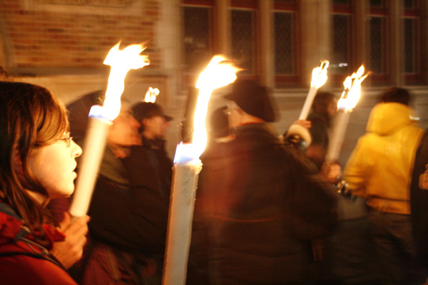 Op zondag 11 november 2007 was "Brugge die schone" het decor van de door het Groene Gordel Front (GGF) georganiseerde fakkeltocht voor bosbehoud. Zo'n driehonderd mensen trostseerden er het hondenweer. Na afloop van de lichtmars verzorgde de anarchistische mobiele actie keuken "Kokkerellen" overheerlijke veganistische wortelsoep en warme wijn voor iedereen.