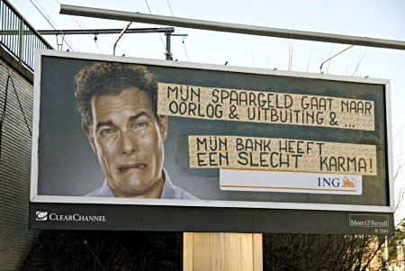 GENT -- De afgelopen weken werd het straatbeeld in ons land overspoeld door huilende gezichten op publiciteitsborden van ING. Door de tekst bij de foto te wijzigen gaven anonieme plakkers de reclameboodschap een gans andere betekenis.