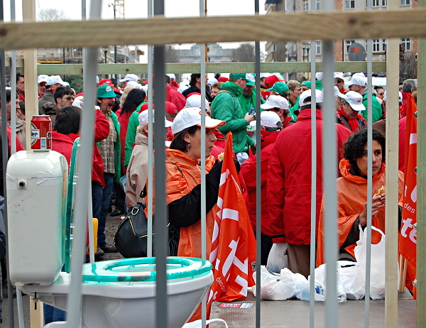 Daarom manifesteerden de vakbonden vandaag aan het gebouw van de Europese Raad in Brussel. Meer dan 400 vakbondsafgevaardigden uit tien verschillende landen kwamen er samen. Om hun actie kracht bij te zetten kropen 10 vakbondslieden voor een uur samen in een geïmproviseerde cel.