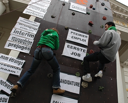 Om de discriminatie aanschouwelijk te maken stelde het ACV een klimmuur op bij de Muntschouwburg in Brussel. De muur telde twee trajecten: eentje vol hindernissen en eentje waarlangs je vlot naar boven kon klauteren. “Allochtonen blijven het moeilijk hebben op de arbeidsmarkt. Als werkloze blijven ze langer zonder werk. Als werkzoekende raken ze met de zelfde begeleiding moeilijker aan een job en als werkende komen ze vaak nog in lagere jobs terecht”, zegt Johan Stassen.