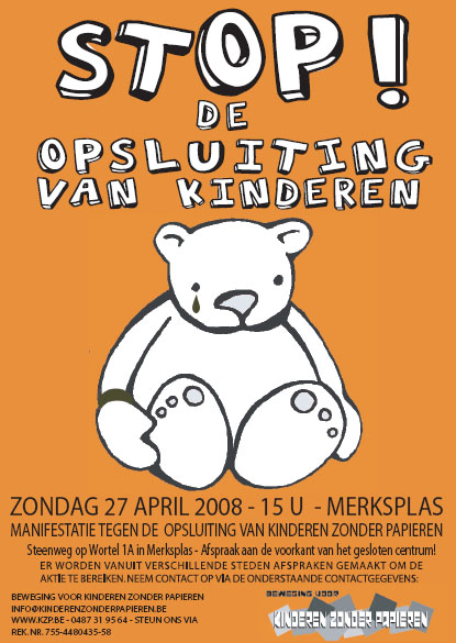 "Uit verontwaardiging en machteloze woede ontstond in 2005 de Beweging voor Kinderen zonder Papieren. De voorbije jaren stelden leerkrachten en klasgenootjes vast dat kinderen van uitgeprocedeerde vluchtelingen van de ene op de andere dag uit de klas verdwenen. Die kinderen worden met hun ouders eerst gevangen gezet in een gesloten inrichting om dan naar hun land van herkomst teruggestuurd te worden, weggerukt van vriendjes, jeugdbewegingen,… kortom uit heel hun sociaal leven."