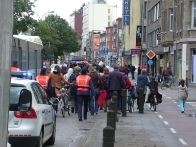 De verhuis-optocht wordt begeleid door de politie en eindigt zonder incidenten aan de gebouwen van UMIVA in de Plantin en Moretuslei 202 in Antwerpen. Er wandelen ook enkele Belgen mee. Daar verwelkomt onder meer Said Mdaouchi van UMIVA de tientallen manifestanten. In een toespraak uit hij kritiek op het beleid van Dewael en hij noemt deze actie legaal, « en als Dewael dat niet vindt en mij een misdadiger wilt noemen, dan ben ik de meest trotse misdadiger van het land! », roept Said Mdaouchi. Alphaa uit Guinea bedankt daarna namens de mensen zonder papieren iedereen die een bezoek heeft gebracht en doet een oproep aan de politici en aan de burgemeester « om hun gezicht eens te laten zien !»