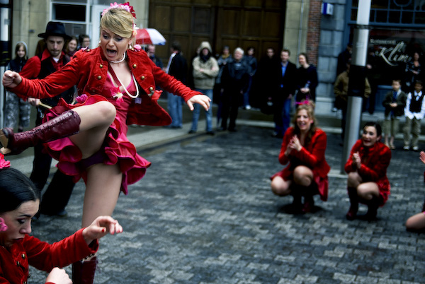 Straatanimatie t.a.v. 1 mei op het Martelarenplein van o.a. Les Fanfoireux en La Guardia Flamenca.