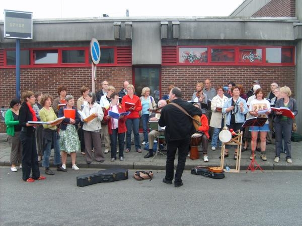 Moe maar tevreden zijn we aan het station van Tielt toegekomen, waar het solidariteitskoor Vamos Pro Lutar ons stond op te wachten voor een muzikale apotheose.