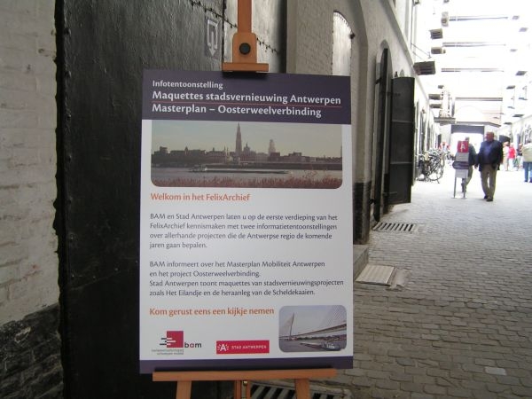 De Oosterweelverbinding moet de Ring van Antwerpen tegen 2013 volledig rond maken. Daarom komt er een toltunnel onder de Schelde en een brug, de Lange Wapper, over het Eilandje. De werken starten begin 2009. Wie daar meer tekst en uitleg over wil, kan vanaf vandaag terecht in het FelixArchief. Ook een maquette van de werken is er te bekijken. Wij gingen eens kijken op het einde van de eerste dag.