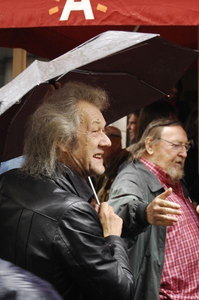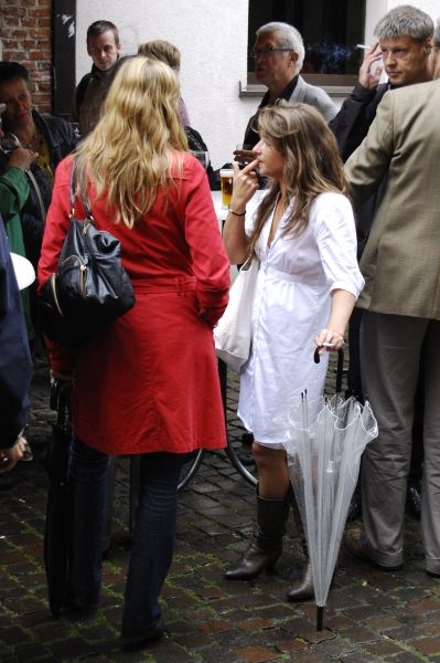 De hardnekkige regenval kon het bonte gezelschap niet weerhouden van een feestelijk glaasje in het nabijgelegen "la Cuisine", een leerwerkrestaurant van de Tewerkstellingsinitiatieven Stad en Onderwijs (Tiso).