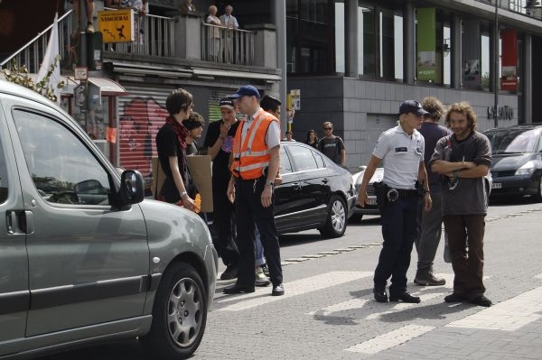 Reclaim the streets! dacht er niet aan een "toelating" te vragen voor de actie.Ze had er ook geen.De media waren aanwezig omdat ze op een rel hoopten en véle administratieve aanhoudingen.Dat gebeurde dus niet.Ik zag op de Grote Markt twee fietsende agenten,aan de kaaien een paar die het verkeer regelden.Bravo!Zijn ze op het "Schoon verdiep" en in de "politietoren" aan de Audaan tot de jaren van verstand gekomen?Je weet maar nooit.