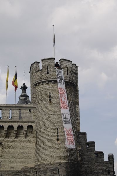 Langs de andere zijde grotendeels journalisten en fotografen, aangevuld met toeristen en toevallige passanten. Er werd opgeroepen de trommelaars te volgen die via de Suikerrui richting het Steen stapten. Daar kwam duidelijk tot uiting dat de hele "demonstratie" slechts op een paar tientallen mensen berustte. Niet echt een volkstoeloop dus.