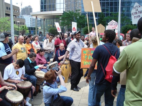 Aan het Noordstation werd de stoet verwelkomt door een 7-tal djembé-spelers, waarop een deel van de menigte spontaan begon te dansen. De organisatoren moesten het feestgedruis zelfs even stilleggen opdat hun speeches zouden gehoord worden. In de speeches beperkte men zich tot het in het Nederlands en het Frans formuleren van de drie eisen en het bedanken voor de talrijke opkomst. Ook ABVV en ACV melden daarna nog even dat de actie hun volledige steun krijgt. Na een laatste spreekster die haar aanvraag voor een sociale woning kwam toelichten, en de ellende die daarmee gepaard ging, was de manifestatie ten einde.
