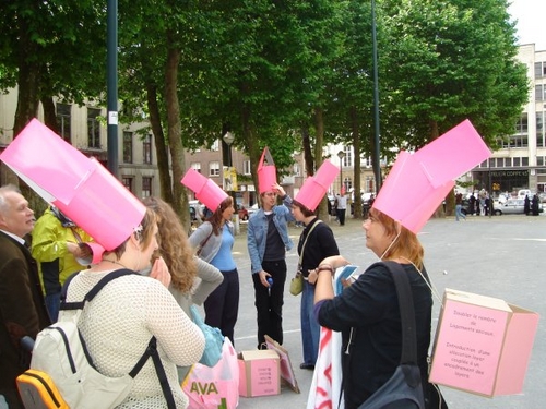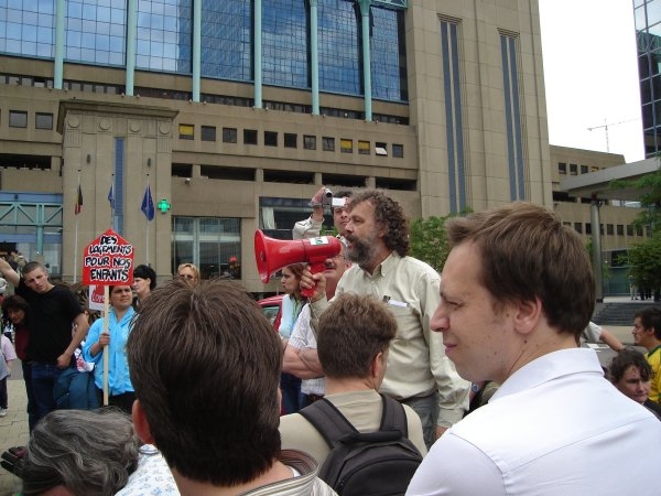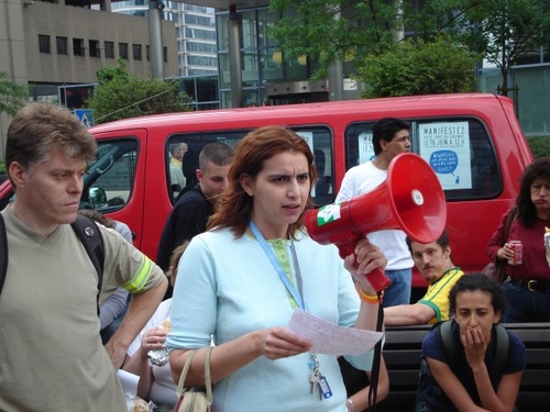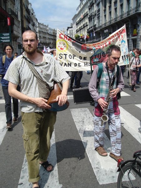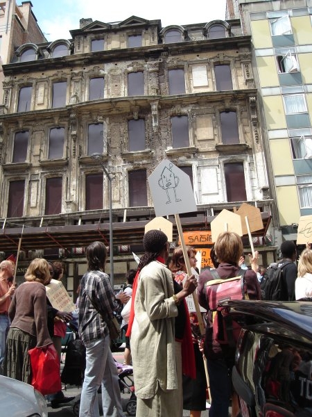 ÉCOLO, ABVV, ACV en GROEN! liepen mee in de bonte stoet die naar het Noordstation trok. Ook verschillende voorbijgangers, die meteen een folder kregen, liepen een eindje met de manifestatie mee. Dat deze actie op sympathie van velen kan rekenen bewijst ook het zeer diverse publiek. Jong en oud, blank en zwart, scandeerden in allemaal verschillende talen hun ergernis over de slechte huisvesting in Brussel. Dat er veel panden leegstaan en daardoor verkrotten steekt velen de ogen uit (zoals op één van de foto's te zien is). Ook het enorm aanbod aan kantoorgebouwen is een doorn in het oog van de Brusselse bevolking. Een immens kantoorgebouw dat langs het parcours te huur stond werd daarom ook uitgejouwd door de manifestanten.