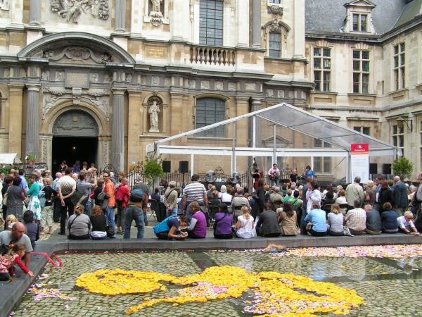 Op vrijdagnamiddag startte de opbouw van een exclusief culinair kunstenaarstapijt op de Handschoenmarkt.Géén bloementapijt,wel een grote A-compositie met alle Antwerpse streekproducten,op basis van een ontwerp van Tony Le duc,internationaal gerenomeerd,antwerps culinair fotograaf.