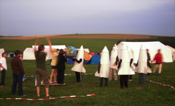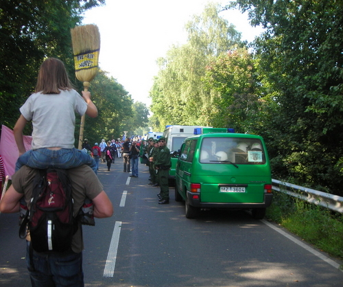 Rond de luchtmachtbasis van Büchel liggen velden en bossen,…Om daar uit weg te geraken is dus niet al te evident, aangezien de hoofdweg naar het aktiekamp ook mee in de rode zone viel.Uiteindelijk gaf de Duitse politie dus het bevel om je uit een bepaalde zone te verwijderen, om een ‘misdrijf’ te voorkomen(over de draad klimmen), maar verplichtten ze je, om andere misdrijven te gaan plegen om niet binnen die rode zone te komen (het betreden van privé-domeinen van de plaatselijke boeren), wat dus inhield dat je door hun koeienweides, schapenweides en maïsvelden moest gaan lopen.