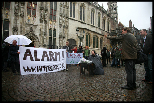 BRUGGE -- Op dinsdag 2 september 2008 omstreeks 17 uur verzamelde Groenfront! in de gietende regen aan de Burg in Brugge. Het lijkt er inderdaad op dat alreeds tijdens deze actie voorbereidingen werden getroffen voor de kap van het Lappersfortbos. Het bos werd afgezet door politie, prikkeldraad, hoogtewerkers, ladderwagens en relbusjes. De politie weigerde echter enig commentaar.
