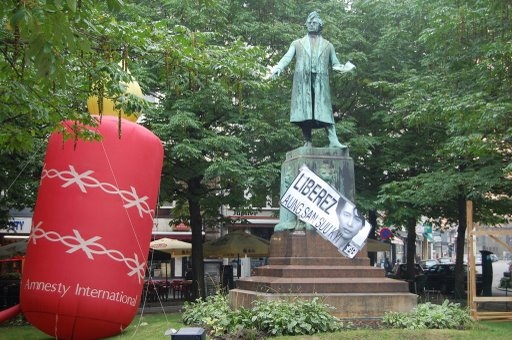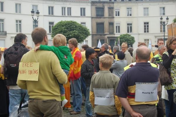 Aung San Suu Kyi, gelauwerd met de Nobelprijs voor de Vrede en democratisch verkozen in 1990, roept ons op om internationale druk uit te oefenen en gebruik te maken van onze vrijheid om ten dienste te staan van de vrijheid van de Birmanen.