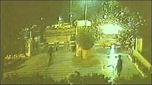In de media zijn beelden van de brandende auto vertoont, genomen vanaf een veiligheidscamera aan de kant van het hotel, de vrachtwagen bleef steken bij de tweede serie versperringen. Je ziet de auto stoppen aan de bareel en vlam vatten. Bewakingspersoneel probeert de auto te blussen..de echte ontploffing is niet vertoont.Voor het hotel is een grote krater ontstaan.