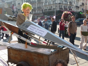 Met het incident van vorige week nog vers in het geheugen -twee Belgische militairen raakten gewond bij een raketaanval in Afghanistan- kwamen zo'n hondertal vredesactivisten samen in Brussel. Hun boodschap was eenvoudig maar krachtig: Geen Belgische F-16's in Afghanistan. Op de trappen van de Beurs bouwden vrijwilligers van Intal, de ngo die het initiatief nam voor deze actie, een levensgrote mozaïek om de aandacht te vestigen de op betrokkenheid van ons land bij die oorlog.