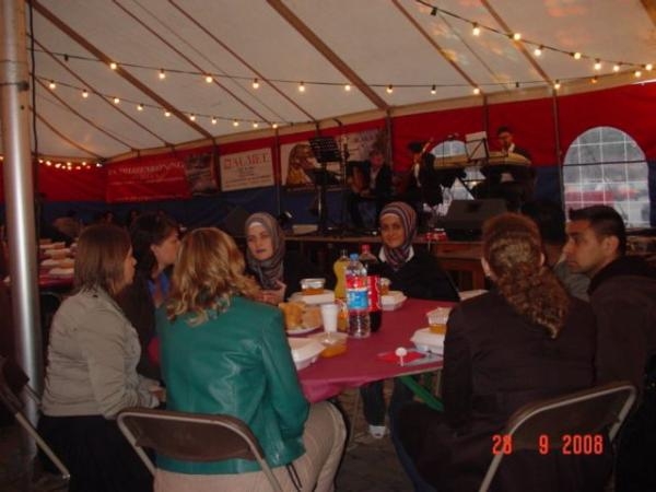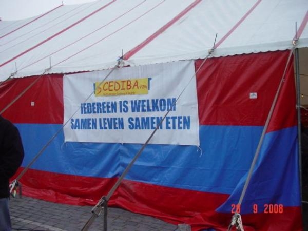 Zo organiseerde vzw Cediba verleden week-end een 'driedaagse'-lees maar s'avonds-in een sfeervolle tent op de Zuiderdokken in Antwerpen.Iedereen was uitgenodigd voor 'Diversiteit onder één dak',of,waar mensen van verschillende achtergronden samen aan tafel zitten.Bij het eten konden de gasten genieten van een informatiemoment en als vervolg traditionele 'soefi muziek'.Er was ook een markt met allerlei cd's en boeken en een bidtentje.(voorlaatste Ramadan avond)
