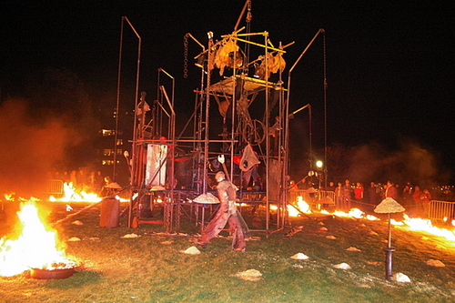 Inge, Annemarie en Hansje lopen over en weer met emmers water.De percussionisten kruipen in de stelling.Gedrum op olievaten.Nog meer vuur.Ogen die bijna uit kassen rollen.Kinderen die kreten slagen van “Ooooohhh “” en “Waaauww!!”
