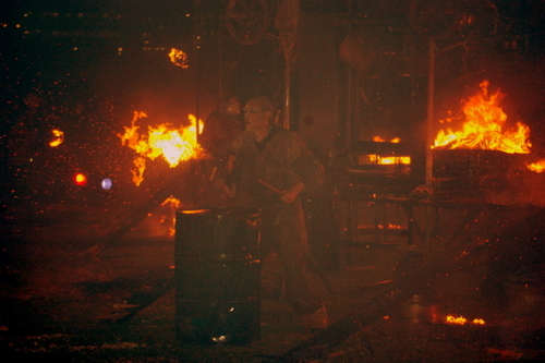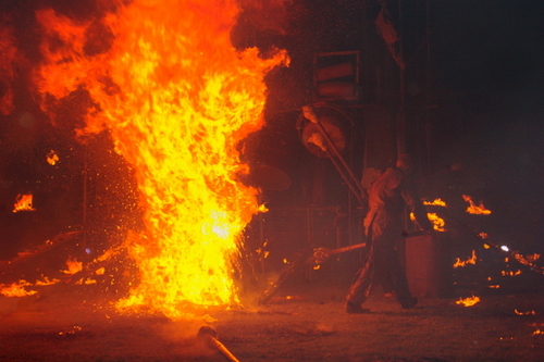 Mijn fototoestel staat niet stil.’T Wordt hier warm.De vlammen worden nog hoger.De wind draait ineens en ik merk dat het publiek achter mij ineens 10 meter verder staat.Vuurgensters fluiten langs mijn gezicht en ik krijg een impressie van hoe een gerookte haring zich moet voelen.Tis niet meer warm momenteel, maar heet,…kan een fototoestel smelten???Piet, Jerry en Simon geven het beste van het beste in de stelling op olievaten, buizen en ijzeren jerrycans.Onder hen vuur, boven hen vuur,…