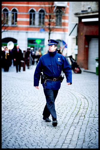 Herdenkingsstoet naar het stadhuis van Leuven onder begeleiding van de Koninklijke Harmonie Sint-Cecilia uit Gingelom onder leiding van Marcel Vandereycken