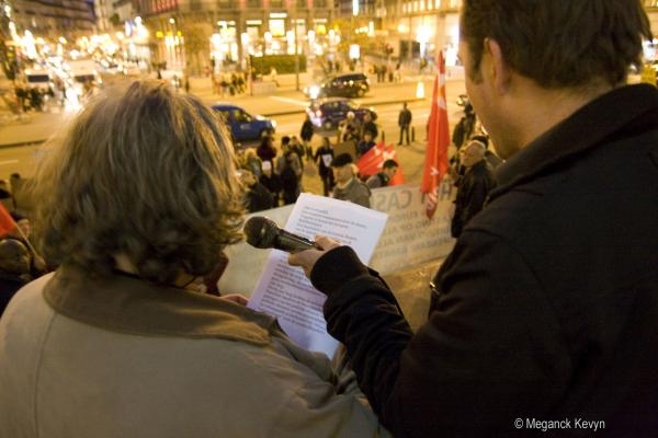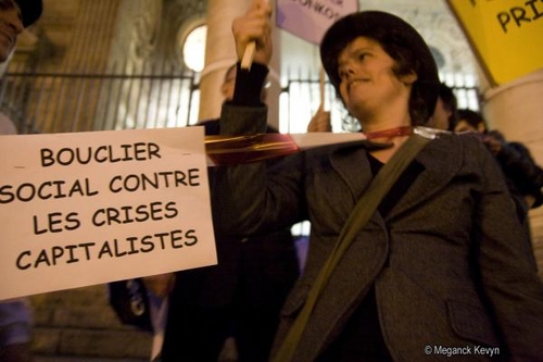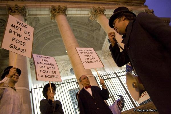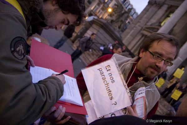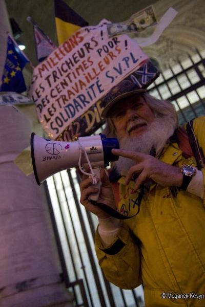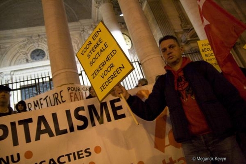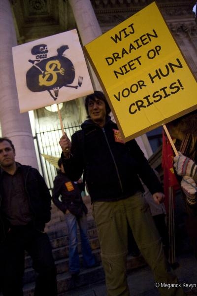 Rassemblement à Bruxelles sur les marches de la Bourse pour protester contre ce que l'on apelle le capitalisme de casino qui consiste à investir d'énormes sommes d'argent dans les banques alors que ce sont les gens qui subissent la crise financière.