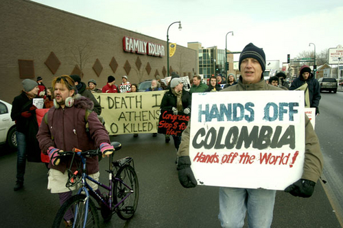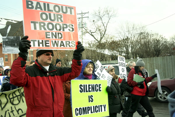 MINNEAPOLIS — 13 dec. 2008 . About 150 demonstrators (literally) took the street of South Minneapolis for the annual Human Right Day protest of the Anti-War Committee. The focus was on human right violations committed or supported by the US government both home, such as police brutality, repression of social movements, war on poor and immigrants, and abroad such as in Iraq, Palestine, Colombia, Somalia or Mexico. The recent riots in Greece were also mentioned on banners.