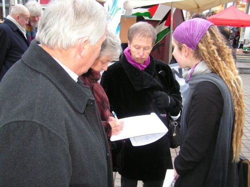 De actie was gericht tegen bezetting van Palestina en de Belgische deelname aan de oorlog in Afghanistan. 17 actievoerders namen deel aan deze vredesactie. Op twee uur tijd tekenden meer dan 350 passanten de petitie tegen de aanwezigheid van Belgische F16 in Afghanistan. Deze petitie is een initiatief van verschillende organisaties en worden afgeven begin januari aan de Minister van Defensie. Eveneens werden 200 handtekeningen verzameld voor een boycot van Israëlische producten. Daarnaast werden heel wat voorbijgangers geïnformeerd via spandoeken en flyers.
