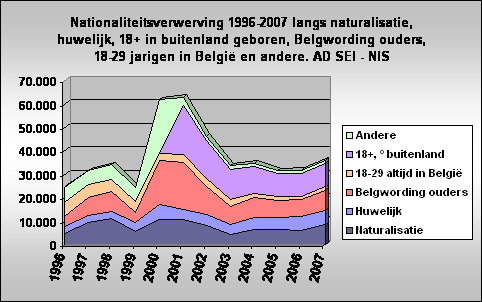 Als de belangrijkste wegen van de nationaliteitsverwerving uitgetekend worden tussen 1996 en 2007 springt vooral de stabilisatie na 2002 op met een eenmalige deuk in de naturalisatieprocedure in 2003 en een uitbouw ervan in 2007 alsmede voor de toekenning van nationaliteit door Belgwording ouders.