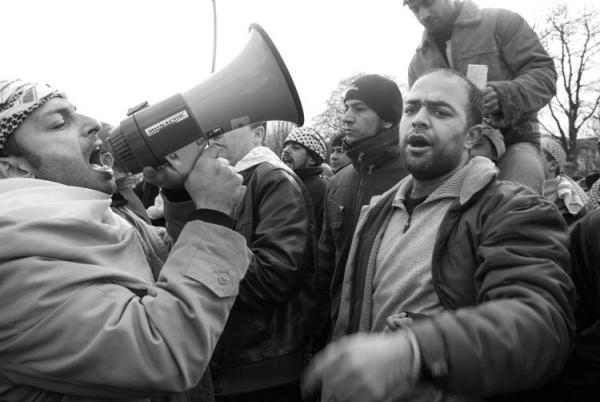 Ik denk dat fotograaf geprobeerd heeft om het verhaal van de betogiong door zijn ogen te vertellen.