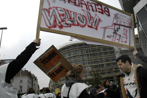 Deze betoging was niet toegelaten en werd onderbroken door de politie voor een identiteitskontrole. Alle doeken en slogans werden in beslag genomen.