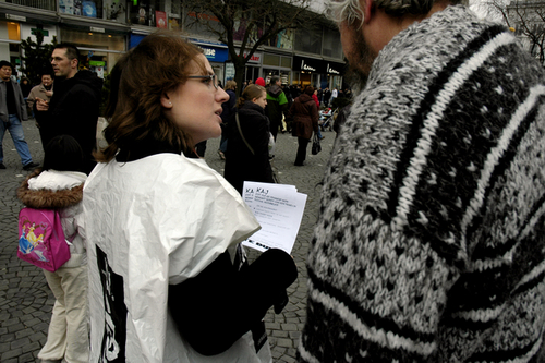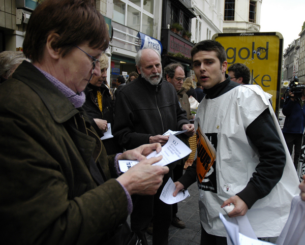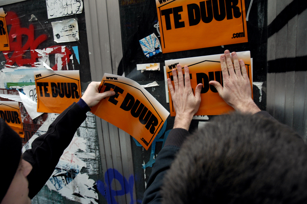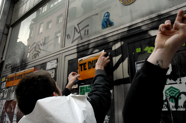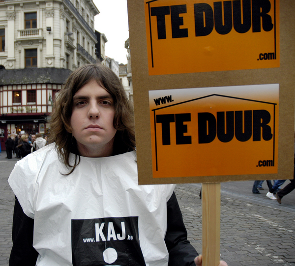 Ils ont distribués des tracts en scandant "Te koop... te huur... alles is te duur !" (A vendre... a louer... tout est trop cher!)