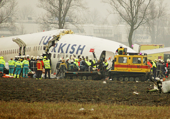 De Boeing 737 van Turkish Airlines verongelukte nabij de Polderbaan tussen het Rotterpolderplein en Schiphol in een weiland beland en in drie delen gebroken.