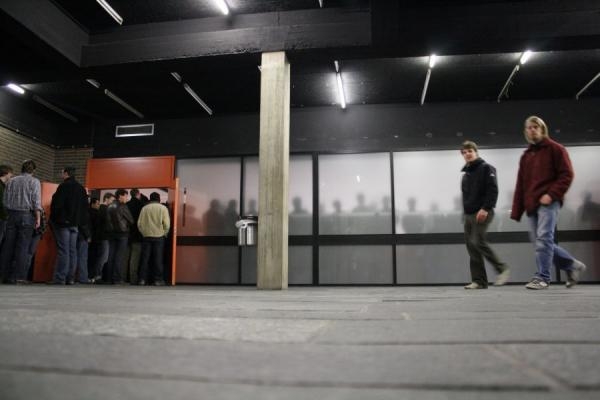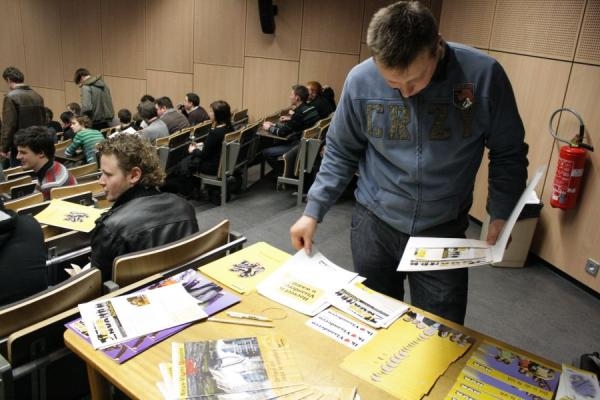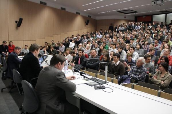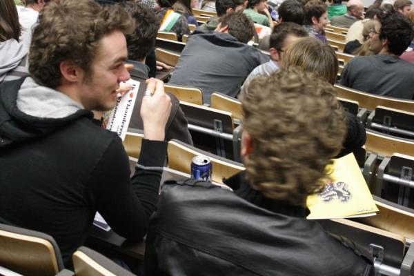 Een overvolle aula(niet alleen de vuilbakken waren vol...)voor deze 'clash' dinsdagavond op de stadscampus van de Universiteit Antwerpen.